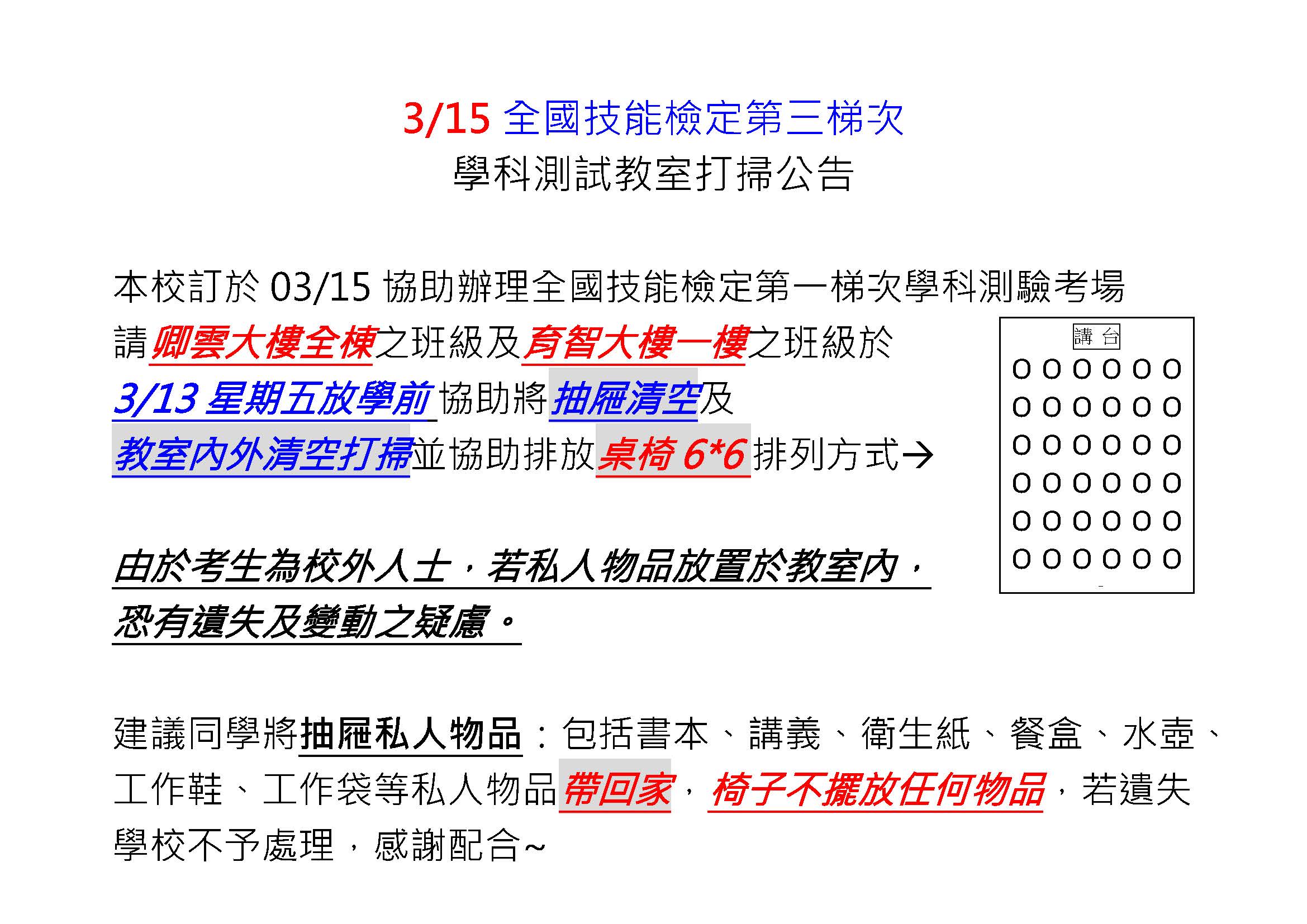 3/13星期五放學前,請卿雲大樓全棟及育智大樓一樓班級教室清空打掃公告