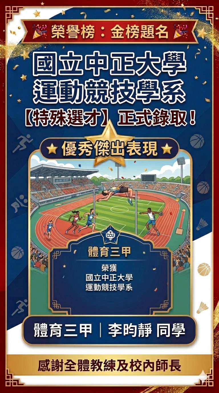 狂賀體育三甲 李昀靜 同學 特殊選才錄取國立中正大學 運動競技學系
